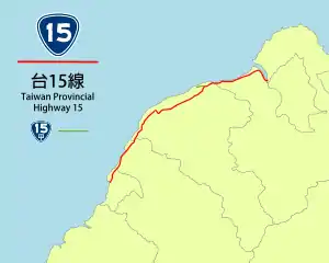 Provincial Highway 15 is a north–south highway that connects Tamsui in New Taipei City with Hsinchu City. The highway is known as Xibin Highway (西濱公路) for the entire stretch. The highway runs along the coasts of northwestern Taiwan. The total length is 83.9 kilometres (52.1 mi; 45.3 nmi).[1]