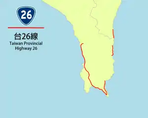Provincial Highway 26 is a Taiwanese highway that starts from Fangshan, Pingtung County and ends in Daren, Taitung County. The highway is also known as Ping-E Highway (屏鵝公路) for the stretch between Fangshan and Cape Eluanbi in Kenting National Park, and Jia-E Highway (佳鵝公路) between Cape Eluanbi and Jialeshui (佳樂水). It is the primary highway to Kenting National Park and the beaches in Kenting. The route length is 93.5 kilometres (58.1 mi).[1]