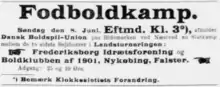 - 1 2 "Fodboldkampen paa Ridemarken" (in Danish). Næstved Tidende: Sydsjællands Folkeblad. 9 June 1913. p. 3.