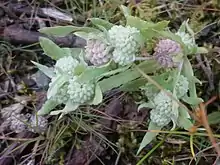 The inflorescence is a small, spherical flower head less than a centimeter wide located at the tip of the stem or in a leaf axils. It is a cluster of several tiny woolly disc flowers surrounded by leaflike bracts but no phyllaries. Each tiny flower is covered in a scale which is densely woolly with long white fibers, making the developing head appear cottony.