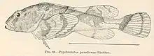 The tadpole sculpin (Psychrolutes paradoxus) is a species of marine ray-finned fish belonging to the family Psychrolutidae, the fatheads and toadfishes. This species is found in the North Pacific Ocean from the Sea of Okhotsk and the Sea of Japan north to the Bering Sea and east and south to the southern Puget Sound in Washington. It is found at depths between 0 and 1,100 m (0 and 3,609 ft), mainly on soft bottoms although it has been reported from rocky substrates, and may be found along the shore. This species reaches a maximum published total length of 9 cm (3.5 in).[1]