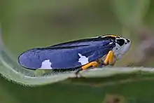 Adults have slate-grey wings, each wing with two white and yellow patches near the outer margin. The head is white, rounded with large dark eyes and small black and yellow marks on the forehead.