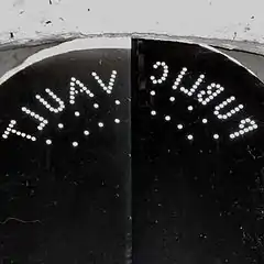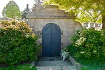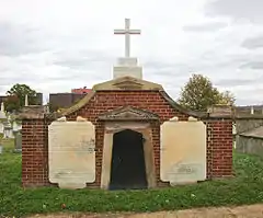 A classical marble facade with baroque scrolls decorates the partially subterranean vault. Double wrought iron doors have the words "PUBLIC VAULT" displayed through vent holes.[6] The vault is constructed of Aquia Creek sandstone, which was also used to construct many important early structures in Washington, including the White House, the Capitol, and the Latrobe cenotaphs in the cemetery.[7] The vault does not have any niches or shelves to hold coffins; the coffins were placed on the floor and stacked if necessary.[8]