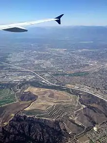 Puente Hills Landfill was the largest landfill in the United States, rising 500 feet (150 meters) high and covering 700 acres (2.8 km2).[1] Originally opened in 1957 in a back canyon in the Puente Hills, the landfill was made to meet the demands of urbanization and waste-disposal east of Los Angeles. By the 1990s, the landfill became an artificial mountain visible around the San Gabriel Valley region. Puente Hills accepted four million tons of waste in 2005. As of October 31, 2013, its operating permit was terminated and it no longer accepts new refuse. The former landfill is in the process of becoming a natural habitat preservation area.[2]