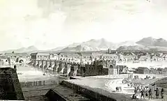 The Puente Grande with wooden superstructure spanning the Pasig River as sketched in 1794 by Fernando Brambila, a member of the Malaspina Expedition.
