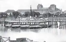 The temporary pontoon bridge that spanned adjacent to Puente Grande after it was damaged by the 1863 earthquake. In the background are the newly reconstructed Santo Domingo Church and the Magellan Monument.