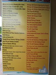 Bilingual menu in Luquillo; it includes such Puerto Rican terms as jueyes ("blue land crab", guineo ("banana"), chapín ("cowfish"), carrucho ("conch"), chillo ("Northern red snapper"), habichuela ("black turtle beans"), arepa, mofongo, canoa.