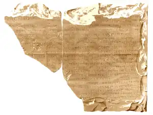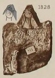 Animals and other valuables were sacrificed to propitiate the gods; such sacrifices had to be done according to strict specifications,[20] which are described on nine surviving inscriptions known as "sacrificial tariffs."[27] The longest of these is KAI 69, known as the Marseille Tariff, after its find-spot, which probably originally stood in Carthage. It lists the portions of sacrifices that the priests of a temple of Baal Saphon were entitled to. The other sacrificial tariffs are CIS I.165, 167–170, 3915–3917, all found in North Africa. These tariffs are similar to a pair of fifth-century BC tariff inscriptions found at the Phoenician city of Kition in Cyprus. They also share some terminology and formulae with Ugaritic and Biblical Hebrew texts on sacrifice. There is also a list of festival offerings, CIS I.166 and many short votive inscriptions, mostly associated with the tophets.[72] Many of these tophet inscriptions refer to the sacrificial ritual as mlk (vocalized mulk or molk), which some scholars connect with the biblical Moloch.[73][74] Votive inscriptions are also found in other contexts; a long inscription on an eighth-century BC bronze statuette found at Seville dedicates it to Athtart (KAI5 294).[75] A fifth-century BC inscription (KAI 72) from Ebusus records the dedication of a temple, first to Rašap-Melqart, and then to Tinnit and Gad by a priest who states that the process involved making a vow.[76] A stele erected at Carthage in the mid-second century BC by a woman named Abibaal shows the sacrifice of a cow's head by burning on an altar; the details of the image show continuity with much earlier Near Eastern sacrificial rituals.[77]