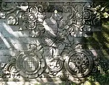 On the side of the main shrine is a depiction of a westerner riding a bicycle. The relief is a depiction of Dutch artist W.O.J. Nieuwenkamp who explored Bali with his bicycle in 1904.[1] This is not the only depiction of a westerner in a Balinese temple: At the Pura Dalem, Jagaraga, to the east of Singaraja, a relief shows a car driven by bearded foreigners being held up by a gangster armed with a revolver. The reason for a number of international-influenced reliefs in the temples of northern Bali is because of it being the entrance to the island of Bali in the early 20th century. The man on a bicycle relief is not in its original condition as it was badly damaged in the 1917 earthquake and was altered during the restoration process. The restoration adds more floral decoration in the original bas-relief.[2][3]