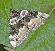 Their wingspan is between 20 and 29 mm and the length of their forewings is between 13 and 15 mm.[3] The ground colour of the forewings is creamy white to bright white. The base and midfield are coloured black to blue black. The latter is crossed by two bright lines. In the midfield band is a deep, jagged spot. In the bright areas between the basal area and the midfield as well as in the marginal field are grey or black spots of varying degrees. The hindwings are whitish and show a small black middle spot.[4] [5] [6]