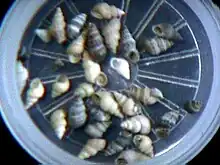 | A group of Pyrgophorus coronatus in the cap of a vial | |
