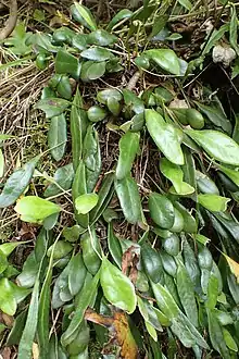 Pyrrosia eleagnifolia, commonly known as the leather-leaf fern, or ota in Māori, is a climbing fern endemic to New Zealand. P. eleagnifolia has thick, fleshy rounded leaves, and grows both on the ground and as an epiphyte.