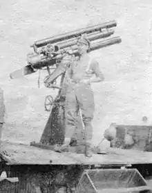 Elswick Ordnance had already developed the gun as a commercial venture and supplied the existing 6 guns to the British government in 1915 when the need for anti-aircraft guns became urgent.[2] All 6 were eventually sent to the Western Front and then various other theatres. Precise theatres of service are difficult to ascertain due to writers often not differentiating between various Mks of 13-pounder guns. 2 guns are known to have been operated by 99th Anti-Aircraft Section at Salonika from July 1917 until the end of the war.[3]