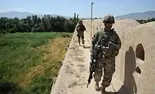 The fort was built in 1889 by Abdur Rahman, the 19th-century “Iron Amir,” the first ruler to unite Afghanistan.[1] Then known as Dehdadi after the village nearby,[2] it was built with British funds and intended both to defend against Russian invasion and to suppress revolts by Uzbek tribes. Rahman described it as "the largest and strongest fort that had ever been built in Afghanistan." It took 18,000 workers 12 years to complete it.[3] In 1929, about 300 Russian troops were besieged inside the fort by 20,000 Turkmens.[4] The name Qala-i-Jangi was probably not given to the fort until the 1940s.[5] The Russians, with Dostum’s support, occupied it again after their 1979 invasion. Mujahideen attacked Qala-i Jangi in 1981, removing 170 pro-Soviet Afghan soldiers. The Taliban occupied the fort for most of the time from 1994 to 2001. Abdul Rashid Dostum, of the Northern Alliance held the fort briefly in 1997, with 20,000 militia.[3]