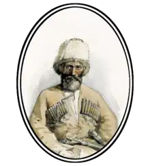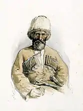A half-length illustration of Qerzech, with ammunition belts, knives and a fur hat.
