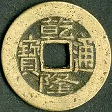 Qianlong Tongbao (traditional Chinese: 乾隆通寶; simplified Chinese: 乾隆通宝; pinyin: qián lóng tōng bǎo; Vietnamese: Càn Long Thông Bảo) is an inscription used on cash coins produced under the reign of the Qianlong Emperor of the Qing dynasty. Initially the Qianlong Tongbao cash coins were equal to its predecessors in their weight and quality but as expensive military expenditures such as the Ten Great Campaigns began to take their financial toll on the government of the Qing dynasty the quality of these cash coins started to steadily decrease. The weight of the Qianlong Tongbao was changed several times and tin was added to their alloy to both reduce costs and to prevent people from melting down the coins to make utensils. As the intrinsic value of these coins was higher than their nominal value many provincial mints started reporting annual losses and were forced to close down, meanwhile the copper content of the coinage continued to be lowered while the copper mines of China were depleting. The Qianlong era also saw the conquest of Xinjiang and the introduction of cash coins to this new region of the Qing Empire.