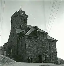 The office building is located on the top of the east side of the observatory. The platform of the building is 77.76 metres above sea level.[7] The 21.6-metre-high building has a 3-floor main body and 7-floor tower.[15] The outer walls are all made of granite stone and the roof slopes with beef-tongue-like tiles. The parapet wall at the top of the tower is constructed into a castellated shape. The entire building is shaped like a medieval European castle.[15][16] According to German naval literature, the Observatory building is designed with the following: offices, laboratories, libraries, public reading rooms, a temperature-controlled basement with clocks, temperature coefficient-measuring rooms equipped with a dual heating system, metalwork workshops and other auxiliary rooms.[17][18] The ground floor of the building lays a fuchsia glazed tile floor connected by stone steps. There is still a white marble stone monuments intact on the corridor wall, engraved with a German poem[16][7] by German poet Ernst von Wildenbruch.|Ernst von Wildenbruch}}
