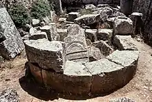 There were two entrances in the south wall, the other sides were closed. The windows were rectangular and there was no roof cornice. In a second construction phase, a portico column was added in front of the south wall. Four capitals of this have survived, which are dated to the end of the 5th or 6th century.[2]