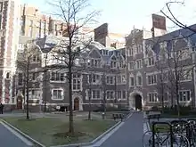 The Quadrangle Dormitories (commonly referred to as Quad) are a complex of 39 conjoined residence houses at the University of Pennsylvania, in Philadelphia, Pennsylvania, United States. The architectural firm of Cope and Stewardson designed the houses in an exuberant Neo-Jacobean version of the Collegiate Gothic style, and completed most of them between 1894 and 1912. The dormitories stretch from 36th to 38th Streets and from Spruce Street to Hamilton Walk (Pine Street). West of the Memorial Tower at 37th Street, the houses on the north side follow the diagonal of Woodland Avenue (now Woodland Walk) and form a long triangle with the houses on the south side. From 1895 to 1971, the dormitories housed only male students.[4]