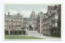 The Quadrangle was the first major dormitory built by the university.[4] Prior to its construction, the undergraduate components of the College (25 to 50 percent of student body) was populated by many commuters from Philadelphia-area residents; students from elsewhere lived in fraternities, Philadelphia relatives or family friends, or found lodgings in off-campus boarding houses, some of which were owned by Penn.[4] The driving force behind building the dormitory was Charles Custis Harrison, heir to a sugar fortune and university provost, 1894–1910. He removed the unofficial campus architect, Frank Furness, replacing him with Cope & Stewardson, who were making a reputation as practitioners of the fashionable Collegiate Gothic style.[7] Walter Cope and John Stewardson had designed exquisitely detailed historicist buildings for Bryn Mawr College beginning in the late-1880s, but the Quadrangle would be a project at a far larger scale and with a much higher level of ornament.[8]