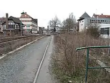 Even before the suspension of traffic on the line to Frose, there were plans to extend the narrow-gauge Selke Valley Railway (Selketalbahn) from Gernrode to Quedlinburg to increase its attractiveness. Originally, the connection was to have been made by installing dual gauge track. After the closure of the standard-gauge line, these plans were abandoned and the Gernrode–Quedlinburg section was regauged.[25] Due to the well-preserved embankment, the construction time was just under a year, with almost all level crossings modernised or replaced by automatic systems. Platform 3 has since then been used as the terminus of the Selke Valley Railway, which has a siding next to a bypass track to handle steam locomotives. In addition, a new water crane was installed at the end of the platform. There are several train journeys daily from Quedlinburg via Gernrode to Eisfelder Talmühle, two of them steam-hauled. Several special excursions have run directly to Brocken. Passenger traffic on the Selke Valley Railway has increased by 20% as a result of the extension to Quedlinburg.[8]