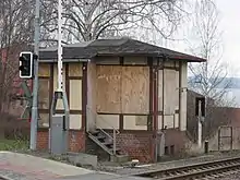 The Quedlinburg wagon factory (Quedlinburger Waggonfabrik), founded in 1927 was south of the Bode and west of the former Schäferwiese ("shepherd meadow"). It had a connection to the Quäke at kilometre 16.20. Tanker and acid pot wagons were mainly repaired here, less frequently other freight wagons and also passenger carriages until the 1960s. More than 300 acid pot wagons were manufactured in Quedlinburg from 1936 to 1964.[26] As an independent company, the factory had about 60 employees. The operation became part of the Einheit repair shop in Leipzig in 1971. There were no own locomotives for shunting on site, so they had to be requested when needed. Steam and diesel locomotives were used here until 1972, afterwards a Kö II locomotive was used until 1988 and a V 60 locomotive was used until its closure on 31 December 1993. After the suspension of passenger traffic on the Quäke, platform 1 West of the station was also used as a siding. But parts of the line to Weddersleben served as a shunting area. After its closure in late 1993, the buildings were offered for sale. Due to their dilapidated condition, parts of the roof collapsed on 6 April 6, 2004[27] and they were demolished in early 2005.