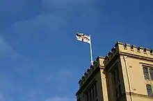 The actual rendering of the escutcheon uses the royal arms not of England but of the United Kingdom. This is superimposed on the arms of John Wesley.