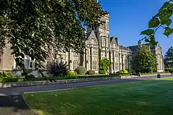 Under the headship of Thomas Sibley the school outgrew the old school classrooms and so a new building was commissioned in 1845 in the Trull area. Due to the increasing popularity of the school, they were forced to vacate the castle premises in 1847 and move into the new building before it was finished. The current school building is a symmetrical Tudor Gothic building built by Giles and Gane in 1845 and has been designated as a Grade II* listed building.[2] The original school site consisted of the main school building and upper playing fields. Since then the buildings have expanded, with the bridge and library (now known as the Old Music Room) being added to the school in the 1920s. This addition was built in commemoration, along with the obelisk on the front lawn, for those who served in the First World War.