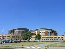 The hospital comprises four, circular, five-storey buildings, connected and surrounded by a wider two-storey building. The ground and first floor levels generally consist of diagnostic treatment, whilst the upper levels consist of inpatient services and wards. Facilities include an accident and emergency (A&E) department, hyper-acute stroke unit (HASU), birthing centre, renal dialysis unit, specialist neuroscience centre, 16 operating theatres and a helipad.[4][5]