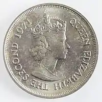 Queen Elizabeth II on a Mauritian 10 rupee coin, 1971