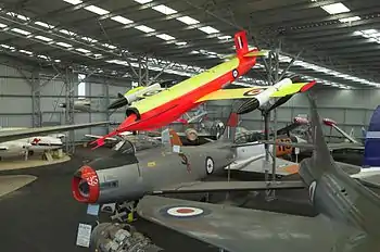 Australian designed or produced aircraft are represented by Commonwealth Aircraft Corporation Wirraway, Winjeel and Sabre, de Havilland Drover and Vampire, Government Aircraft Factories Jindivik, Turana and Canberra, Kingsford Smith Aviation Service Cropmaster, Transavia Airtruk, Victa Airtourer and Calair Skyfox.