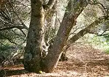 Quercus wislizeni, known by the common name interior live oak,[4] is an evergreen oak, highly variable and often shrubby, found in many areas of California[5] in the United States continuing south into northern Baja California in Mexico. It generally occurs in foothills, being most abundant in the lower elevations of the Sierra Nevada, but also widespread in the Pacific Coast Ranges—where since 1980 it has been known as a separate species Quercus parvula[6][7]—and the San Gabriel Mountains. It was named for its collector, Friedrich Adolph Wislizenus (1810–1889).[4]