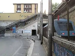 The station is semi-subterranean with the platform opening directly to the street.