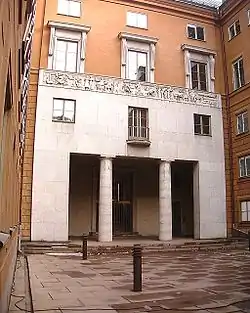 In contrast, the voluminous and heavy mass of Kanslihuset on the alley's eastern side, designed by Wolter Gahn and Gustaf Clason and completed in 1936, opens up to the alley in form of the western end of the series of courtyards which pierces the building.[2] The façade is decorated with a limestone frieze called Departementsfrisen (The Department Frieze") by Sig Blomberg.[3]
