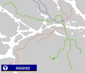 Rågsved metro station is on the Green line of the Stockholm metro, located in Rågsved, Söderort. The station was inaugurated on 13 November 1959 as the southern terminus of a one-station extension from Högdalen. On 1 December 1960 the line was extended further to Hagsätra.[2] The distance to Slussen is 8.5 km (5.3 mi).