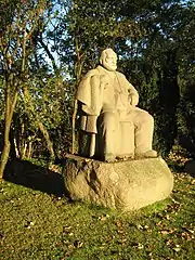 Rødkilde folk high school was founded by Frede Bojsen (1841–1926), an active politician and influential chairman of the parish council in nearby Stege where his father was the pastor. In order to test out his plans for a high school, on 1 May 1865, Bojsen rented a farmhouse in the village of Tjørnemarke a few kilometres north of Stege. On 26 July, he married Karen Anker, a Norwegian, and on 26 October he opened the school with some 30 students from the north of Falster and Møn. Given their initial success, Frede and Karen decided to build a proper school. Thanks to Karen's rich family and the dowry she received, they were in a position to go ahead with their project without delay. They opted for the present site with views over Stege Nor, a stretch of inland water, and the hills of Møns Klint beyond. In fact, Karen was never to see the finished buildings. She died during childbirth on 22 September 1866, just a couple of days before the students were due to arrive.[4][5] Her husband never forgot her and always reminded his colleagues that the school was a gift from the Ankers. For this reason, on certain occasions, a Norwegian flag is flown at the school. An imposing statue of Bojsen (pictured) by Danish sculptor Gunnar Hansen stands on the school grounds.