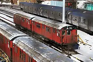 The R26s wore several paint schemes during their service lives. The cars were delivered in a dark olive green paint scheme similar to the R21s and R22s. In 1970–1975, the R26s were repainted into the MTA corporate silver and blue scheme.[1] In 1982–1983, the R26s were repainted full white (roof, bonnets, and sides were all painted white) in an attempt to combat graffiti.[2] During rebuilding by Morrison–Knudsen at Hornell, New York, from 1985 to 1987, the R26s were repainted into Redbirds with a deep maroon red body, black front bonnets and anti-climbers, and a silver roof.