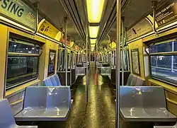 All SIR cars were overhauled for a second time between 2007 and 2010 as a part of scheduled maintenance program. Several improvements included the repainting of the bulkheads, rebuilt trucks, new dark floors, newly repainted periwinkle bucket seats, and updated logos; unlike the NYCT cars, the SIR cars retained their original blue "M" MTA decals during their first overhaul.[9] The cars have been undergoing further intermittent rounds of scheduled maintenance as their parts age over time.