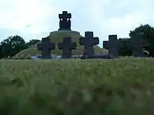 The Government Code and Cypher School (GC&CS) code-breaking organisation at Bletchley Park read German radio signals encrypted by the Enigma cypher machine and was part of the system of wireless listening posts, traffic analysis and direction finding used against Germany during the war.[4] Ultra decrypts on 11 and 18 March 1944 established the existence of Panzergruppe West and that its headquarters was in Paris.[5] A big increase in wireless traffic from Panzergruppe West was detected by the British Monitoring Section on 8 June 1944, when the 17th SS Panzergrenadier Division came under the command of the Panzergruppe. The site of the source was identified by High-frequency direction finding (huff-duff) at the château in the commune of La Caine, about 12 mi (19 km) to the south-west of the city of Caen. The information was forwarded to Supreme Headquarters Allied Expeditionary Force (SHAEF) and other headquarters in Normandy.[6][lower-alpha 3] Panzergruppe West had taken up residence at the château and left its vehicles in the orchard with no other camouflage.[2][lower-alpha 4] The presence of four large wireless trucks, office caravans and tents was confirmed by reconnaissance aircraft.[9]