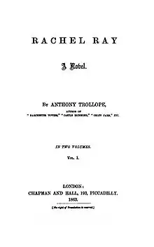 Rachel Ray is an 1863 novel by Anthony Trollope. It recounts the story of a young woman who is forced to give up her fiancé because of baseless suspicions directed toward him by the members of her community, including her sister and the pastors of the two churches attended by her sister and mother.