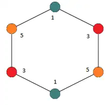 In graph theory, a branch of mathematics, a radio coloring of an undirected graph is a form of graph coloring in which one assigns positive integer labels to the graphs such that the labels of adjacent vertices differ by at least two, and the labels of vertices at distance two from each other differ by at least one. Radio coloring was first studied by Griggs & Yeh (1992), under a different name, L(2,1)-labeling.[1][2] It was called radio coloring by Frank Harary because it models the problem of channel assignment in radio broadcasting, while avoiding electromagnetic interference between radio stations that are near each other both in the graph and in their assigned channel frequencies.