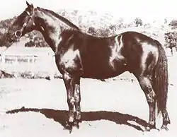 In circa 1928, Radium was sold to Herb O’Neil, who, as a friend of Donald Beaton, had ridden the horse in competitions for Beaton when he had been unable to get away from his property. Herb O’Neill competed extensively with Radium, winning over a large area of the state. Just prior to the Second World War (WWII), Radium won a Championship Campdraft at Kempsey, New South Wales with the next ten placings going to Radium’s sons and daughters. Radium was also highly successful in led contests for the best type of Stock Horse. During WWII, at a Dungog Bushman’s Carnival over 20 horses were competing in the led stock horse class. In this event Radium received the first placing with the remaining four all being his sons.[2]