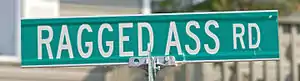 One night near the end of 1970, in which he and fellow prospectors had worked hard but found far less, he was drinking with some of them in the family Quonset hut. Reflecting on their circumstances, Rocher joked that the street should be named "Ragged Ass Road" since they were all "ragged ass broke". "[My father] felt he should be able to name it because he owned six of the nine lots on the road and he thought he could name it appropriately", his son recalled later. The men put up a sign that night.[2][10] The term's use as a place name might not have been original. There was reportedly a Ragged Ass Mine on the lake in earlier years.[11]