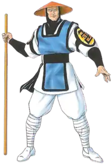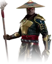 Raiden (Japanese: 雷電) is a fictional character in the Mortal Kombat fighting game franchise by Midway Games and NetherRealm Studios. Based on the Japanese deity Raijin, he is depicted as the god of thunder who possesses control over lightning. He debuted in the original 1992 game and has appeared as a playable character in every main installment except Mortal Kombat 3 (1995) and its first update. In the storyline of the games, Raiden is the protector of Earthrealm. He fulfills his duty by selecting and training the warriors who defend Earthrealm from various threats, while also participating directly in the realm's defense. Raiden generally serves as a mentor figure to the franchise's heroes, although he sometimes assumes a darker role in the story, which sees him become more ruthless in his protection of the realm. One of the franchise's central characters, Raiden has appeared in various related media outside of the Mortal Kombat games, including guest appearances in NBA Jam Tournament Edition (1995), NFL Blitz (1997), Unreal Championship 2 (2005), and Injustice 2 (2017). He has generally received a positive reception and is among the series' most popular characters for his design and special abilities.