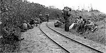 Marines rest along the narrow gauge Japanese railroad on Saipan, July 1944