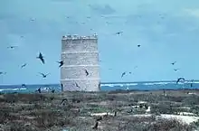 Ships bound north from Australia to Asia generally took the Outer Passage before turning west through the Great Barrier Reef to Torres Strait. As the area was notorious for shipwrecks, the beacon was built in 1844 to assist navigation. The beacon was built mostly of local materials: coral limestone quarried on site; shells burned to make lime for mortar; and timber from the Martha Ridgway which was wrecked nearby in 1842. Though serving as a landmark for shipping and used by crews, the beacon soon became obsolete after the northern passage was discovered. In 1890 the JT Arundel Company began mining guano on Raine Island, with a workforce of 100 Chinese. Their extensive quarries are evident over much of the island, though there is little sign of the former jetty, buildings, tramway and locomotive. The most obvious gravesite, which is marked by a tombstone, is that of Annie Eliza Ellis who died in 1891. No commercial activity is known to have occurred since 1892, though the beacon tower has been used unofficially for conveying messages, as seen in hundreds of inscriptions on the inner walls. Raine Island, with its beacon, quarries and tombstone, remains a principal wildlife habitat, while dominated by the convict-built beacon.[1]
