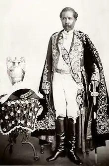 By taking this new role, Rainilaiarivony became the first Hova to concurrently serve as both prime minister and Commander-in-Chief.[20] The sociopolitical transformation that had been triggered by the strangling of Radama II reached its zenith with Rainilaiarivony's consolidation of administrative power. Rasoherina and her successors remained the figureheads of traditional authority, participated in political councils and provided official approval for policies. The prime minister issued new policies and laws in the Queen's name.[23] However, the day-to-day governance, security and diplomatic activities of the kingdom principally originated with, and were managed by, Rainilaiarivony and his counselors. This new level of authority enabled the prime minister to amass a vast personal fortune, whether through inheritance, gifts or purchase, including 57 houses, large plantations and rice paddies, numerous cattle and thousands of slaves.[24] The most prominent of Rainilaiarivony's properties was the Andafiavaratra Palace, constructed for him on the slope just below the royal Rova compound by English architect William Pool[25] in 1873.[26]