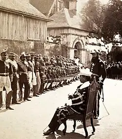 Beginning in 1872, Rainilaiarivony worked to modernize the army with the assistance of a British military instructor, who was hired to recruit, train and manage its soldiers.[27] Rainilaiarivony purchased new local and imported firearms, reintroduced regular exercises and reorganized the ranking system.[28] He prohibited the purchasing of rank promotions or exemptions from military service and instituted free medical care for soldiers in 1876. The following year Rainilaiarivony introduced the mandatory conscription of 5,000 Malagasy from each of the island's six provinces to serve five years in the royal army, swelling its ranks to over 30,000 soldiers.[36]