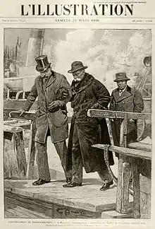 The agreement drafted between the French and Malagasy governments did not clearly establish a French protectorate over the island, partly because recent French military involvement in the Tonkin Campaign had begun to turn popular opinion against French colonial expansion.[28] The Malagasy crown agreed to pay ten million francs to France to settle the dispute, a sum that was partly raised through the unpopular decision to increase fanampoana (forced labor in lieu of cash taxes) to mobilize the populace in panning for gold in the kingdom's rivers.[43] This expense, coupled with Rainilaiarivony's removal of $50,000 in silver and gold coins from the tomb of Ranavalona I to offset the cost of purchasing arms in the run-up to the First Franco-Hova War, effectively emptied the royal treasury reserves.[44] Capitalizing on Madagascar's weakened position, the French government then occupied the port town of Antsiranana and installed French Resident-General Le Myre de Vilers in Antananarivo, citing vague sections of the treaty as justification. The Resident-General was empowered by the French government to control international trade and foreign affairs on the island, although the monarchy's authority over internal administration was left unchallenged.[28] Refusing to acknowledge the validity of the French interpretation of the treaty, Rainilaiarivony continued managing trade and international relations and unsuccessfully solicited assistance from the United States in maintaining the island's sovereignty. In 1894, the French government pressed Rainilaiarivony to unconditionally accept the status of Madagascar as a French protectorate. In response, Rainilaiarivony broke off all diplomatic relations with France in November 1894.[45]