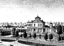 The Randall House is a two-story balloon frame octagon topped with a cupola, with a one-story rectangular-shaped gable-roof wing on one side. The wing is the original house on the property, incorporated into later construction. The house measures about forty feet long by twenty-eight feet wide. A flat-roof runs around seven sides of the building. Doors are on the north and west sides, and the windows are two by two double-hung sash units. The cupola windows are single Gothic style units.[2]